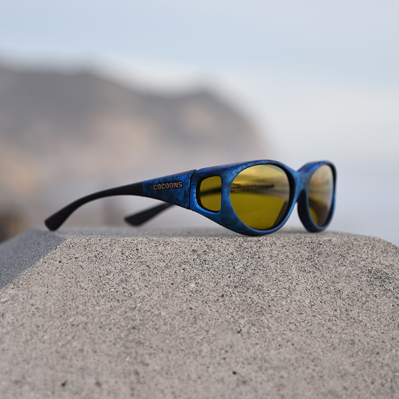 Waves of electric blue wash around our bright yellow polarized lens system. With a unique highlighting ability, our true yellow tint is perfect for use in low light conditions such as dawn and dusk. The electric appearance of the ink finish is incredible when paired with a yellow lens tint that transmits a maximum amount of light at 100% polarizing efficiency. The smallest fitovers in the world are perfect for petite prescription frames and for children.