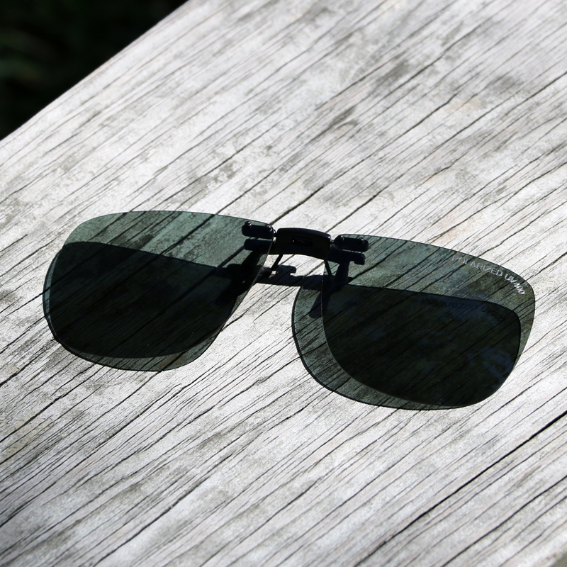 Versatile square flip-ups are designed to fit a broad range of med-large eyewear shapes. These professional grade flip-ups feature scratch-resistant Polaré polarized gray is a neutral tint that delivers natural color definition and contrast.  Gray is a popular tint for every day use in bright light conditions where true color perception and minimal contrast enhancement is desired. Transmits 15% of visible light.